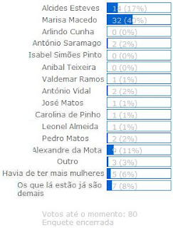 "Dos 80 leitores que não tinham mais nada de importante para fazer e se deram ao trabalho de votar nesta sondagem, existem 40% que apreciam as qualidades de Marisa Macedo no desempenho da sua função na assembleia municipal. 17% preferiram destacar o papel de Alcides Esteves como apaziguador dos ânimos. (...)"