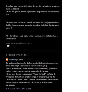 Uma referência no blog "O Burriqueiro" sobre a nossa passagem pelo Luso no Verão passado. O Autor daquelas linhas é o André Melo, mais conhecido por nós na EUC como "Bilha". Curioso é termos ficado a saber, no comentário de um dos outros responsáveis daquele blog, que o nosso Alcides, "In illo tempore", costumava apanhar o comboio na estação de Canelas, Estarreja. Ele há coisas...