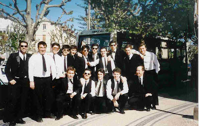 Acompanhou-nos nesta saída o Sr. António Dias Lucas, pai de Rui Pedro Lucas, que como é do conhecimento geral é autor de várias letras das nossas composições originais. A esta distância temporal surgem já diversas dúvidas: se, por um lado, esta foto parece ter sido tirada no aeroporto de Lisboa, por outro inclinamo-nos mais para o ter sido na Rodoviária de Coimbra, o que justifica a presença do Francisco Costa, que provavelmente nos terá auxiliado com o transporte da bagagem, não sendo crível que nos tenha levado a Lisboa.
