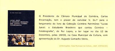 Fomos surpreendidos não só pelo convite pessoal do Autor como também e igualmente da CMC. Tentaremos fazer-nos representar, mas no caso de tal não ser possível, desde já apresentamos as nossas maiores felicitações pela ocasião que certamente enriquecerá o património histórico-documental desta tão peculiar forma de arte que é a canção coimbrã.